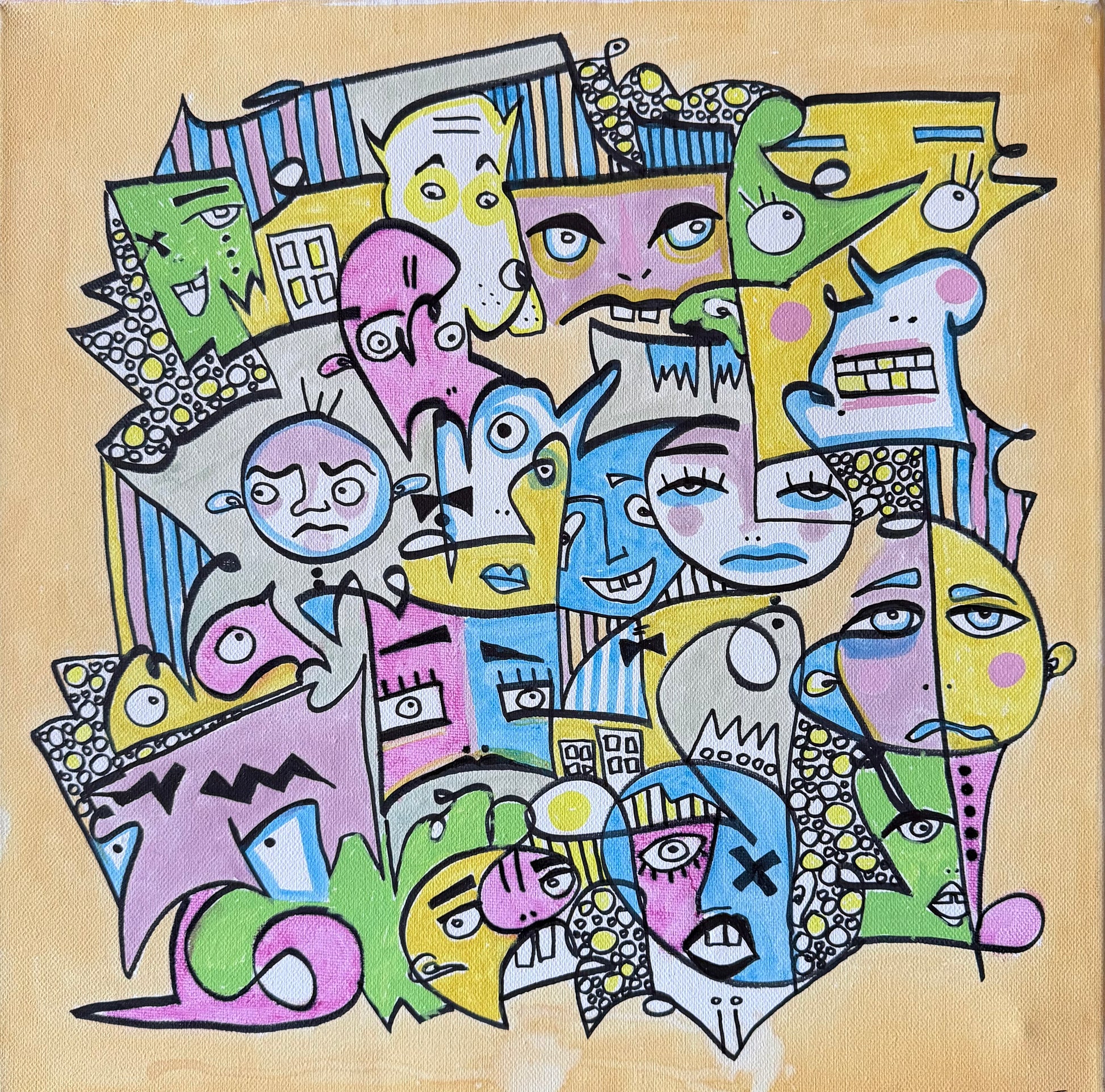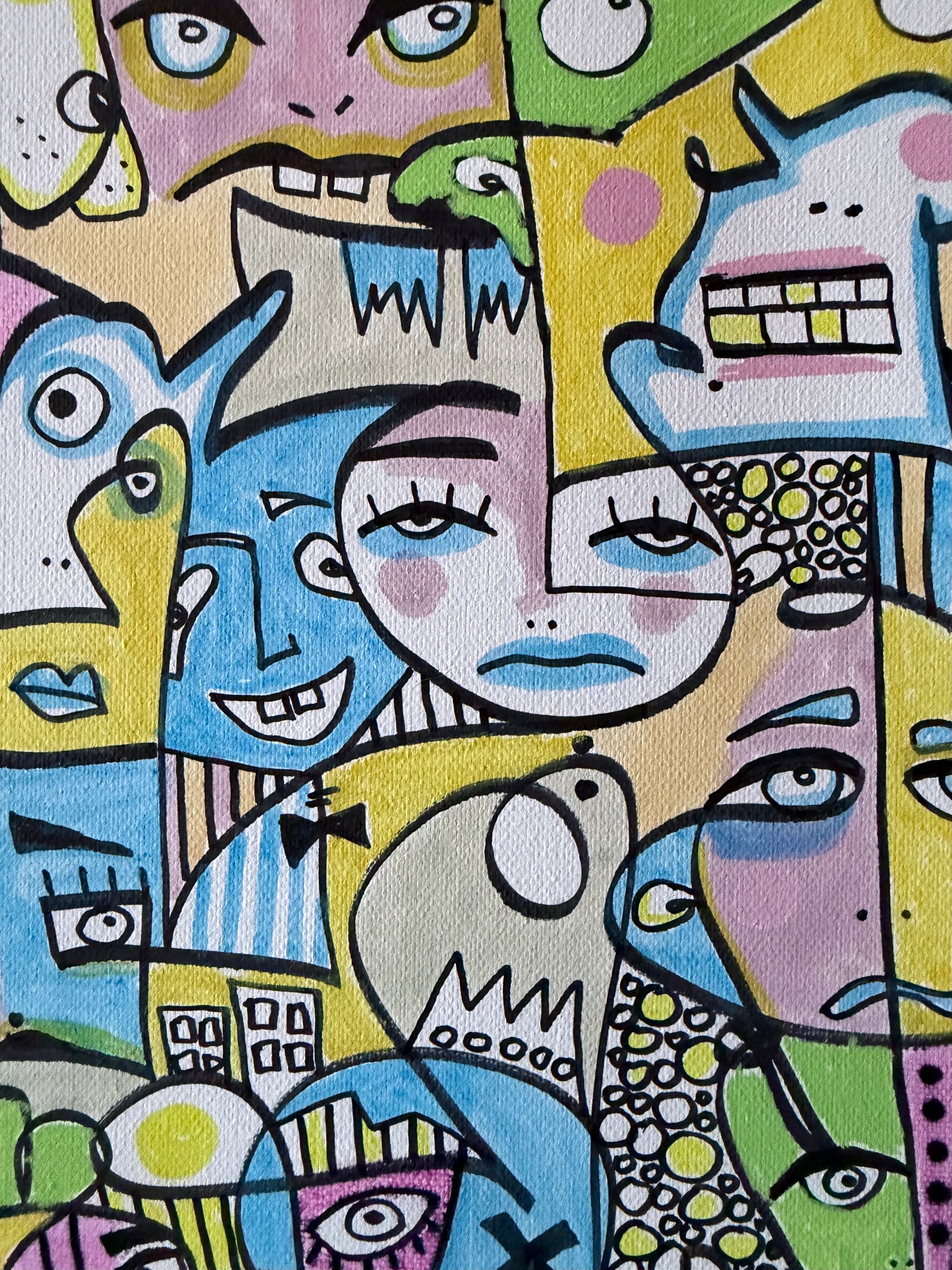 Pastel palette cubistic painting inspired by a festival in Portugal in summer 2023 where Aneta got stucked on a festival, that took place 2 hours from Lisbon. She and a 50 other participants got stuck there at 7am after the night of partying, because the shuttle didn't arrive for the last group.