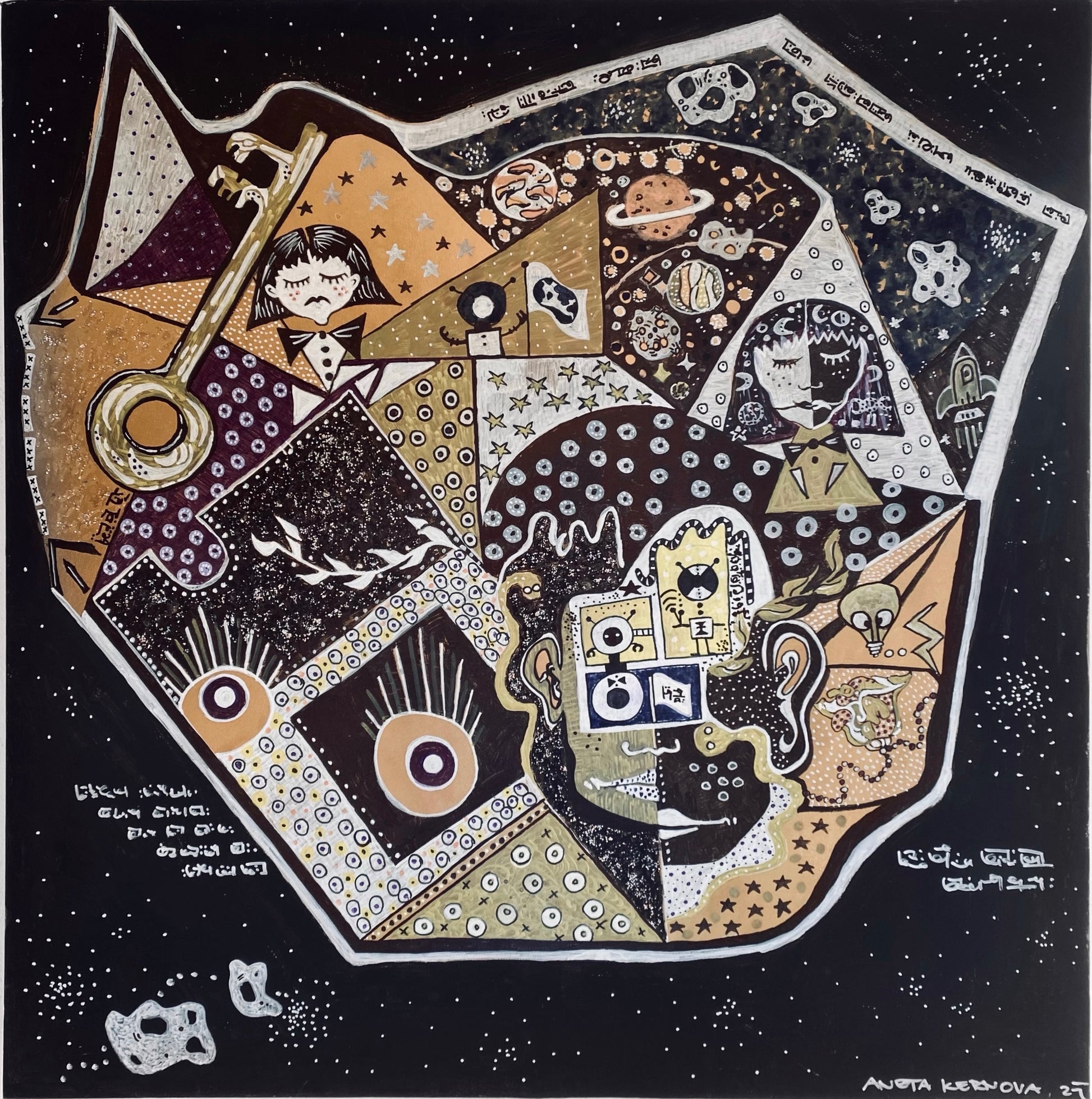 An original painting called Space. Out of this painting a whole Naivista Space collection was created and showcased in Paris Fashion Week show in 2023.
